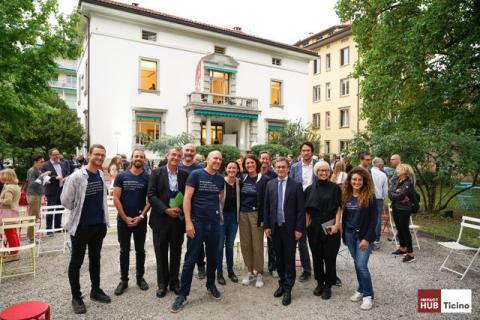 L'équipe de l'association lors de l'inauguration de l'Impact Hub Ticino, avec le Conseiller d'État et directeur du département des finances et de l'économie du canton du Tessin ainsi que les autres intervenant-e-s à la table ronde.